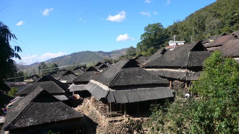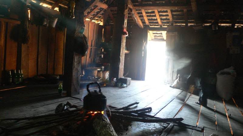 Kurz vor Sonnenuntergang kamen wir in unserer ersten Herberge an. Einem Bauernhaus eines Bulang-Dorfes, versteckt in einem dicht bewaldetem Hang. Unser Aufenthalt glich einem Sprung zurück in die Vergangenheit. Bis auf moderne Annehmlichkeiten wie Telefon, Strom, TV, Motorräder und einem kleinen Dorfkiosk ist das Leben der Bulang nicht anders als vor 300 Jahren oder länger. Man wohnt in einem auf Stelzen gebauten Haus aus Holz (heute jedoch nicht mehr aus Bambus, sondern stabileren Sorten und mit Tonschindeln gedeckt), in dem darunter die Tiere wohnen. In der Mitte des großen Zimmers befindet sich eine Feuerstelle, an der gekocht, gewärmt und darüber Körbe etc. geräuchert werden. Man sitzt auf Holzhöckerchen oder auf dem Boden. Die Menschen laufen den Großteil des Tages, zwischen den frei umherlaufenden Schweinen und Hühnern, Barfuß. Und stetig traf man auch Hennen mit ihren piependen Kücken.