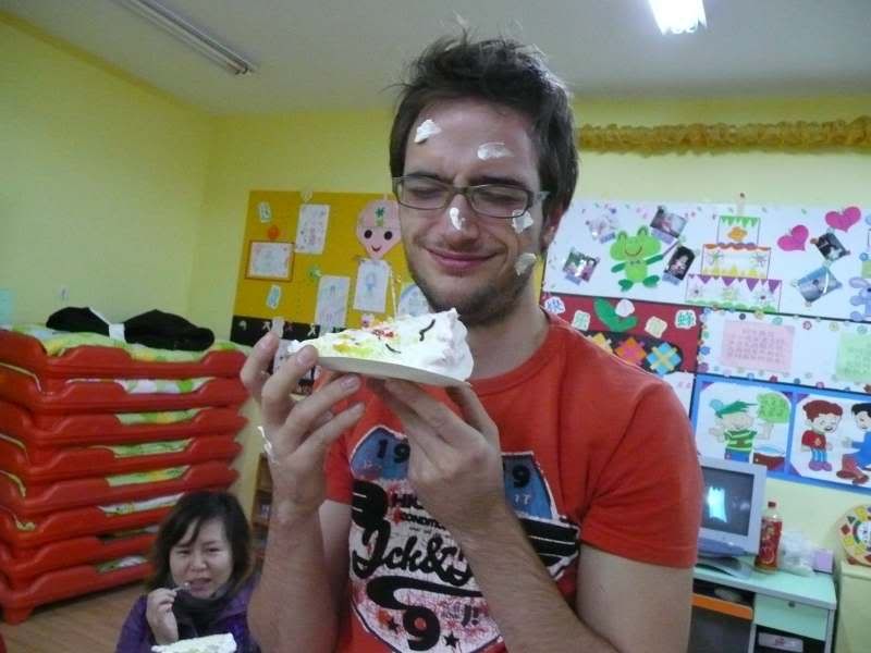 Die letzten Tage im Kindergarten verbrachte ich hauptsächlich damit noch Fotos und Videos zu machen. Vor allem wollte ich die dämlichen Bewegungsabläufe der Tänze festhalten. Aber leider kam es nicht mehr zu Stande, dass die Übermotivierten es vorführten und manche Lieder wurden gar nicht mehr angespielt. Für den letzten Abend dann besorgte ich eine große Torte, auf der in Chinesisch „Mi Saifan sagt Tschüss“ geschrieben stand. Diese wurde mit viel‘ Alberei und Beschmierung meines Gesichtes gegessen. Doch wie es sich für ne chinesische Party gehört, sitzt man nicht einfach nur faul auf seinem Platz und frisst, sondern verlangt von seinem Ehrengast ein Tänzchen! -_- Und als das vorbei war noch ein Ständchen dazu. Aber davor hab ich mich gedrückt =P. Außerdem wurde „Reise nach Jerusalem“ und „Jeder darf ein Foto mit Stefan machen“ gespielt. Einer nach dem anderen kam nach vorne, posierte neben mir und wurde auf Zelluloid festgehalten. Manch eine ohne Kommentare, manch eine mit viel Gegröle und der Aufforderung mir einen Kuss zu geben (was sich aber niemand traute. Erst bei einem anderen Spiel wurde Han Zhihui so lange genötigt, bis sie mir einen Kuss auf die Backe gab). Als dann die normalen Fotos zu langweilig wurden, durfte ich noch eine Lehrerin auf den Armen halten oder mit zwei anderen Chachacha Tanzen. Dumm nur, dass sie es nicht konnten und ich es ihnen innerhalb einer Minute beibringen sollte -_-´ .