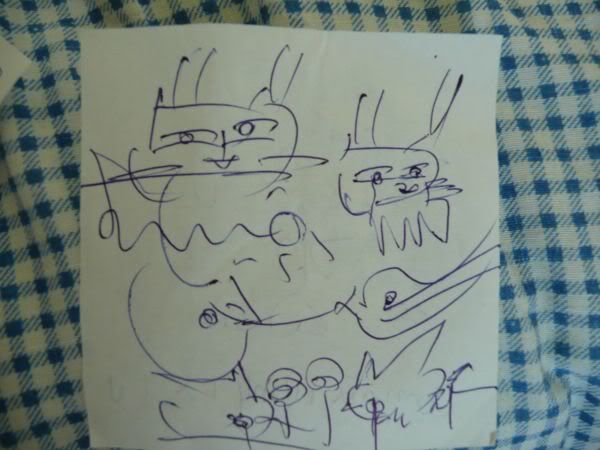 Noch seltsamer war allerdings eine Frau, die wir danach auf der Straße kennen lernten. Eine Koranerin, die wegen ihrer behandelten Zähne nicht sprechen konnte und sich deshalb nur mit Zeichensprache und Bildern auf einem Block kommunizierte. Sie konnte auch nur wenig Chinesisch, deshalb schrieb sie auch selten Sätze. Zudem war sie schon recht knülle, wollte aber trotzdem, dass wir ihr was zum Trinken oder essen bestellten. Sie war schon über 50 nehm ich an. Das ganze kam mir so surreal vor und ich hatte auch keine Lust auf sie, aber Daniel spielte mal mit und "unterhielt" sich mit ihr. Etwas schwer zu beschreiben alles, deswegen häng ich euch ein Bild von so einer Notiz an, damit ihr selbst seht, wie seltsam das alles war.